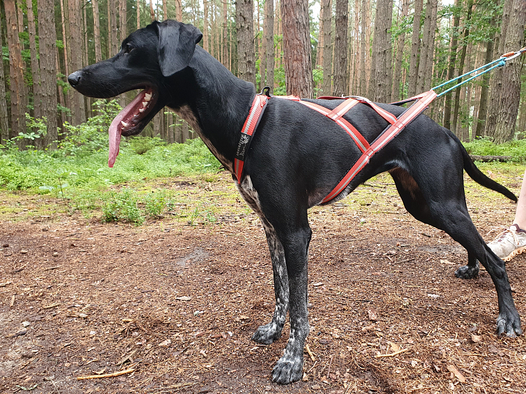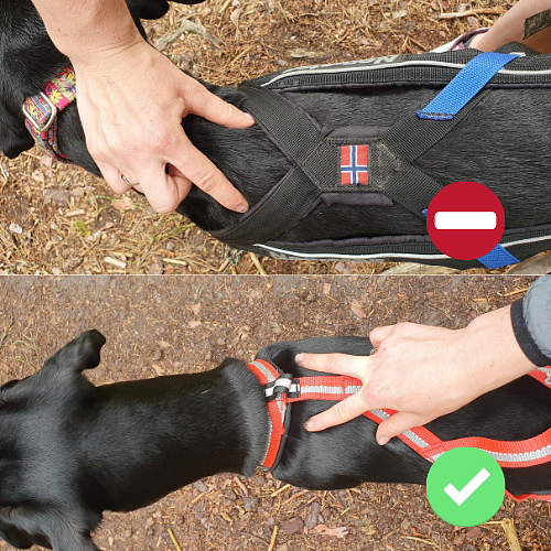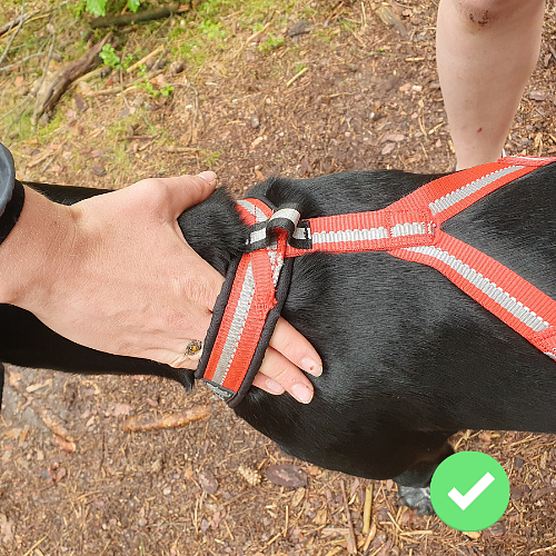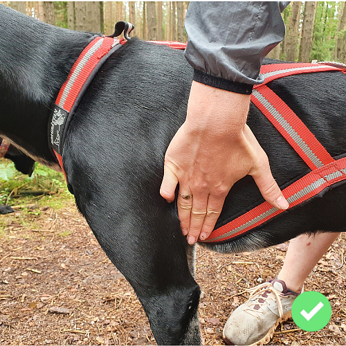 Mezi loket a popruh postroje (do podpaží) můžete dát 2 - 3 prsty. Je důležité, aby byl při hodnocení postroj skutečně v tahu. Ve chvíli, kdy pes zabere posune se postroj o pořádný kus dozadu.