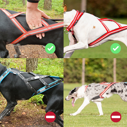 Pes musí být schopen v postroji volně dýchat. První kontrolou je, že budete schopni bez omezení zasunout zepředu do chomoutu palec když postroj natáhnete. Poté nezbývá nežli vyzkoušet v pohybu přesvědčit se, že pes v tahu nesípe.