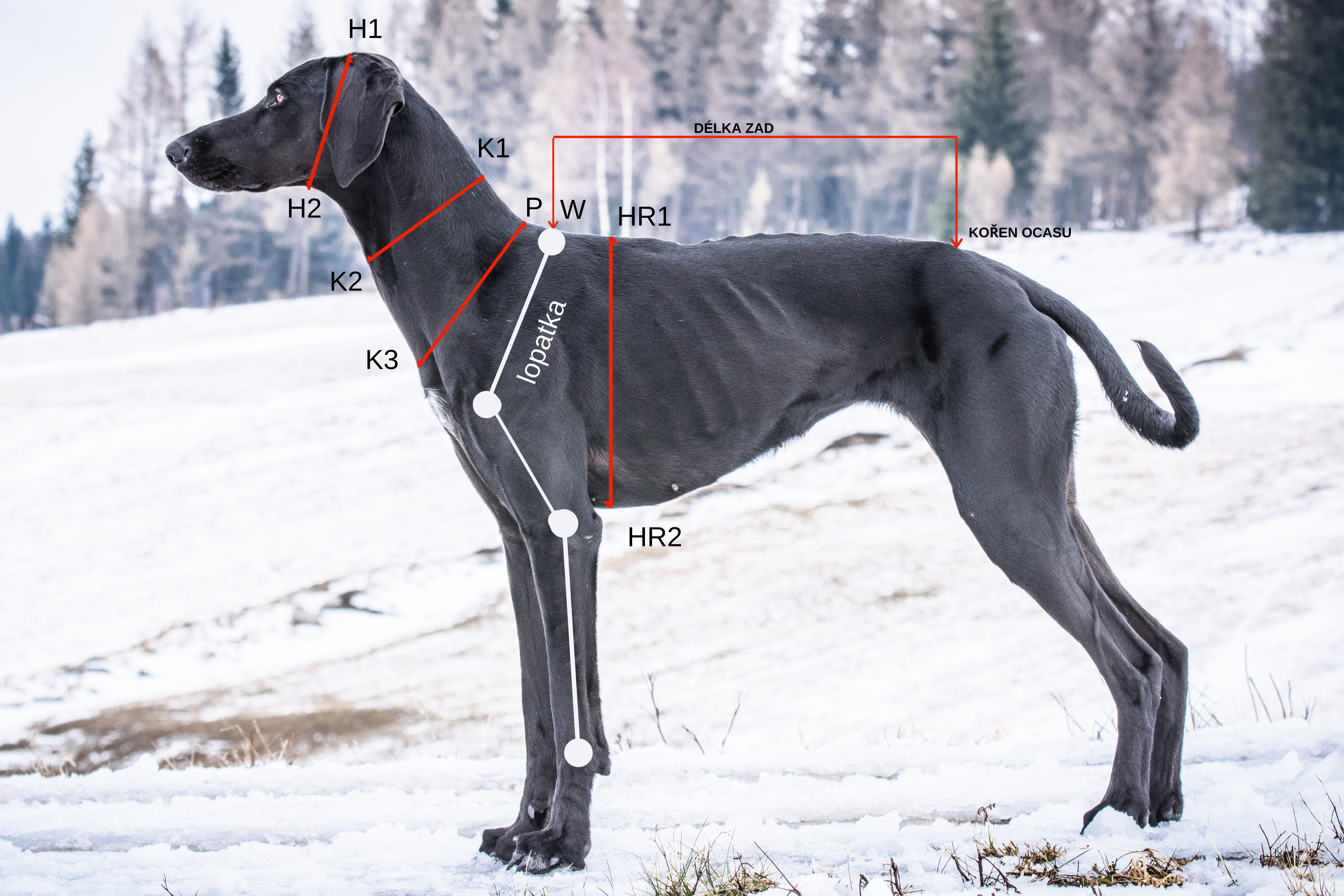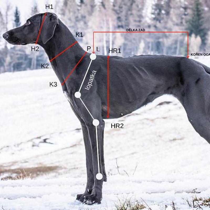 - Měřte metrem těsně u psa. Měřte pouze na jedné straně od bodu K3 k bodu P (neobtáčejte metr okolo psa). Míru vynásobte 2 krát - dosáhnete tak přesnějšího výsledku.