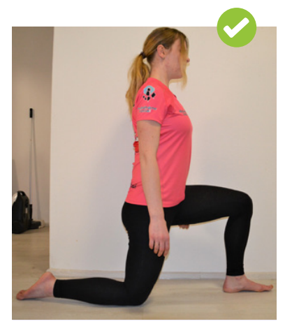 Tohle je základní kompenzační cvik. Mrkni na fotku a pak se nastav do pozice jako kdybys chtěl udělat výpad. Koleno na zanožené noze polož na zem a přenes váhu dopředu. Opři se o pánev (pánev sroluj dolu jako zmrzlinu) a nepředkláněj se. Pohlídej si, že ti koleno nepředbíhá kotník.